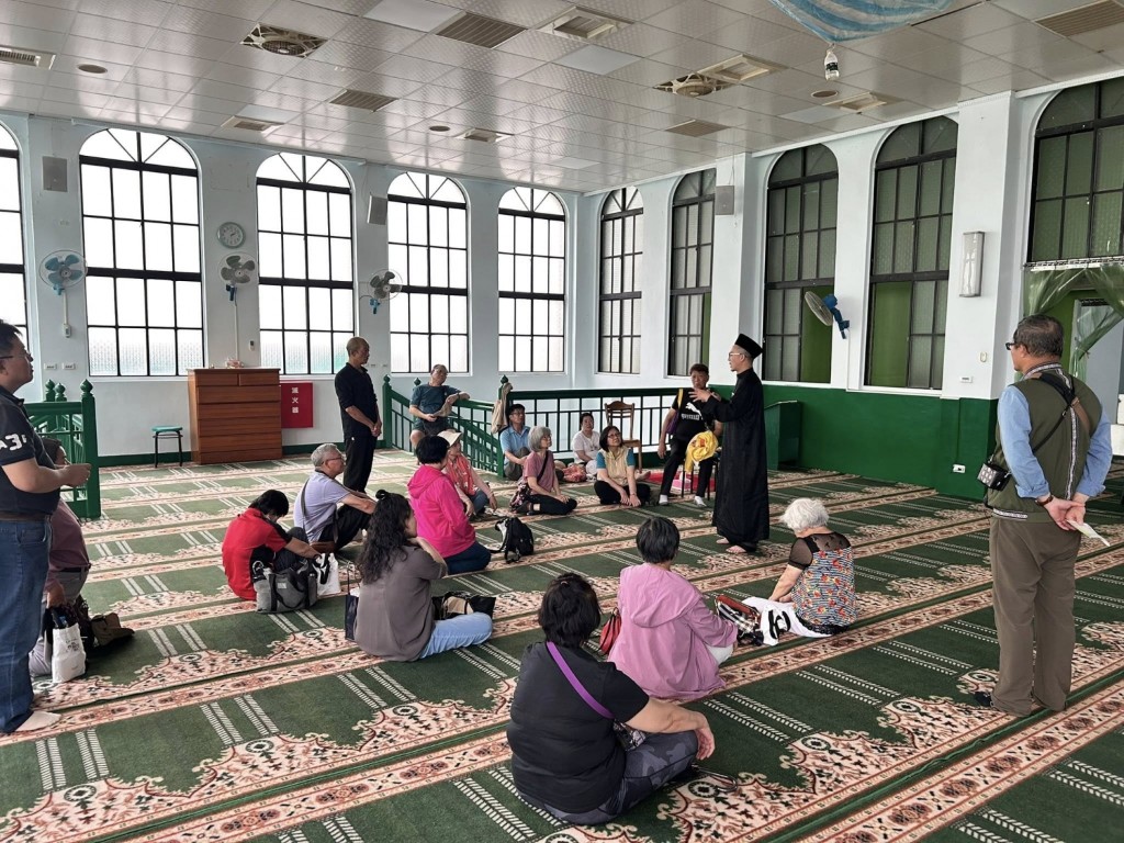 在旅程中,也要感謝龍岡清真寺馬秉華副教長,在短短半個小時內,帶領社區民眾及學員們參觀清真寺內部,也講解了遜尼派和什葉派的差異,甚至還解釋了阿拉伯文的發音、禮拜的方式,展現了多元文化交流的機會,可說是相當精彩!