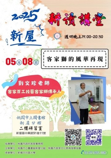 五月份的耕讀講堂演講主題為〔客家獅的風華再現〕,邀請到劉文珍老師的長公子來分享介紹,認識各種獅的差異性和表演方法,水上跳樁的技藝真是讓人驚豔,獅藝文化淵源流長,值得大家持續探究傳承發揚。
