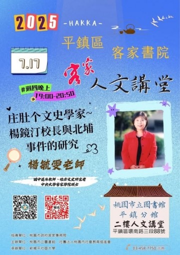 今晚(7/17)在平鎮圖書館二樓人文講堂,我們迎來了本月客家書院的重磅講座——由文史學者 楊毓雯老師 帶來精彩分享:「庄肚个文史學家:楊鏡汀校長與北埔事件的研究」。