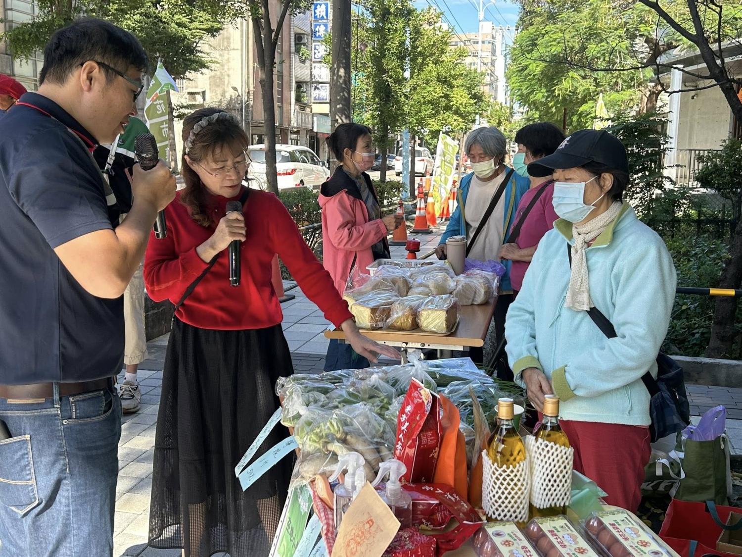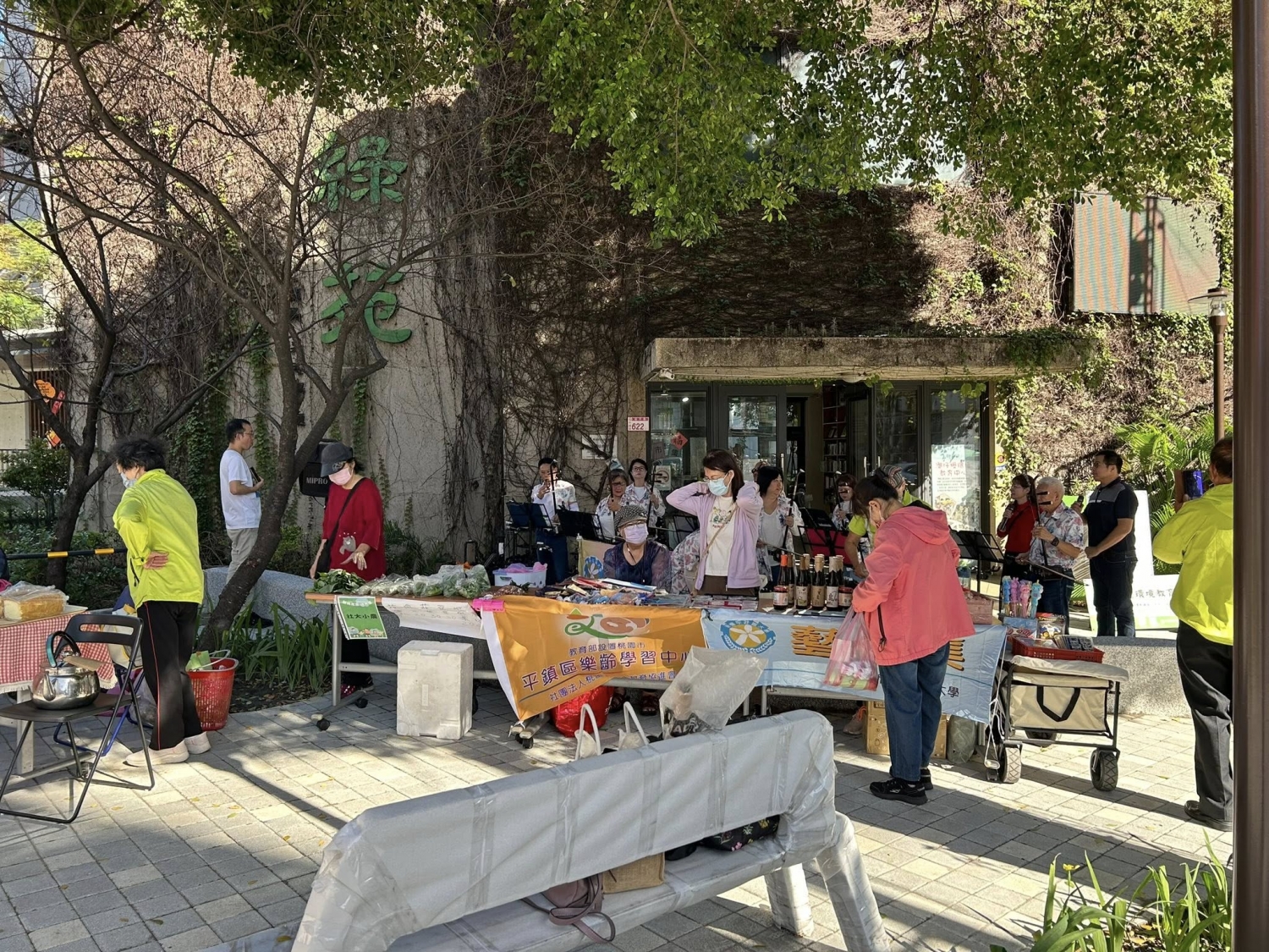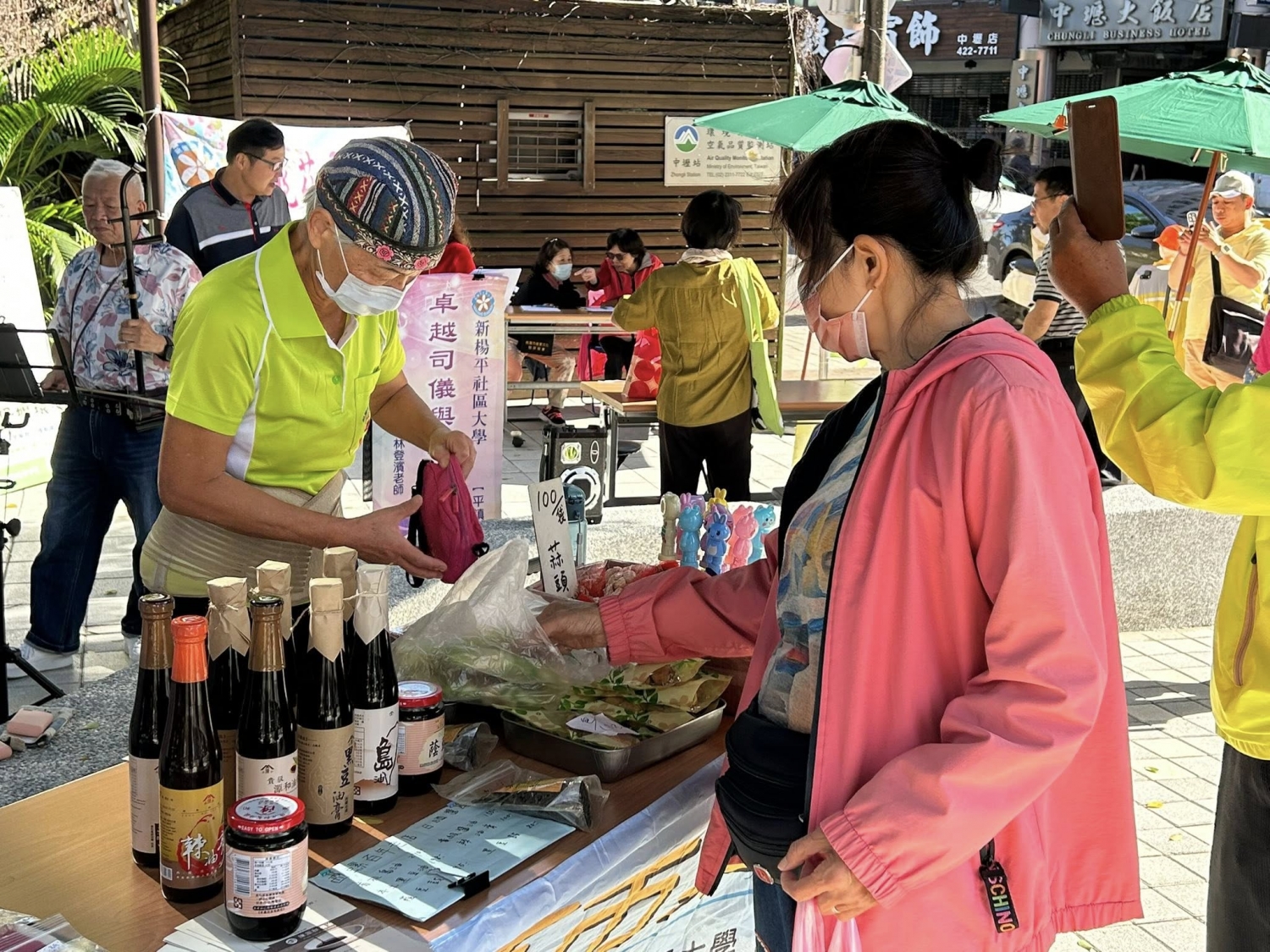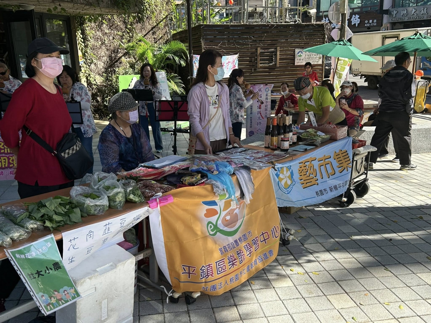 日子舒適且風和日麗,現場有社大有機農民市集班、易經生活智慧班、藝市集、平鎮樂齡等班級參與,一起販賣各式蔬菜、二手好物、美食等,十分熱鬧。