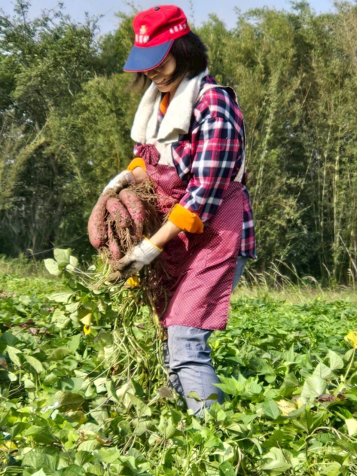 8 月 16 日,我們插下第一根甘藷的插阡,那一天烈日與汗水交織,但大家心裡都滿是希望;9 月 13 日,我們一起除草、挖溝、施肥,像照顧初生的孩子般細心;10 月 5 日與 11 月 8 日,我們反覆拉藤、整理植株,讓甘藷的生命順著土地的紋理向下扎根。到了 11 月 23 日,社大夥伴們終於忍不住試挖第一批地瓜,當一條條帶著泥土香氣的甘藷從土裡被拉出時,那份驚喜與滿足,像是收到生命給予的第一份獎勵。