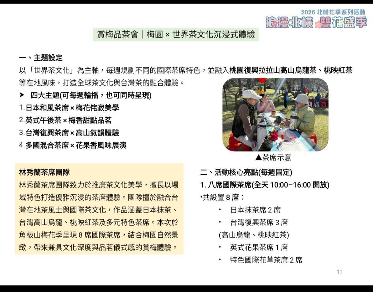 2026北橫花季系列活動~漫步行館賞梅品茶活動,以〔世界茶文化〕為主軸,由社大曾信光/林秀蘭老師所帶領的茶文化社團來協助,包含日本和風茶、英式午後茶、台灣復興茶和多國混合茶等,共設有八席茶席,本週六登場的是桃園復興茶,25日最終場為多國混合茶,歡迎前往参與,地點為角板山行館公園內梅園。